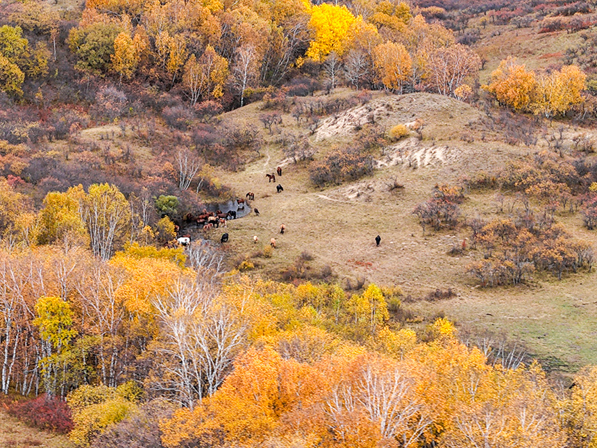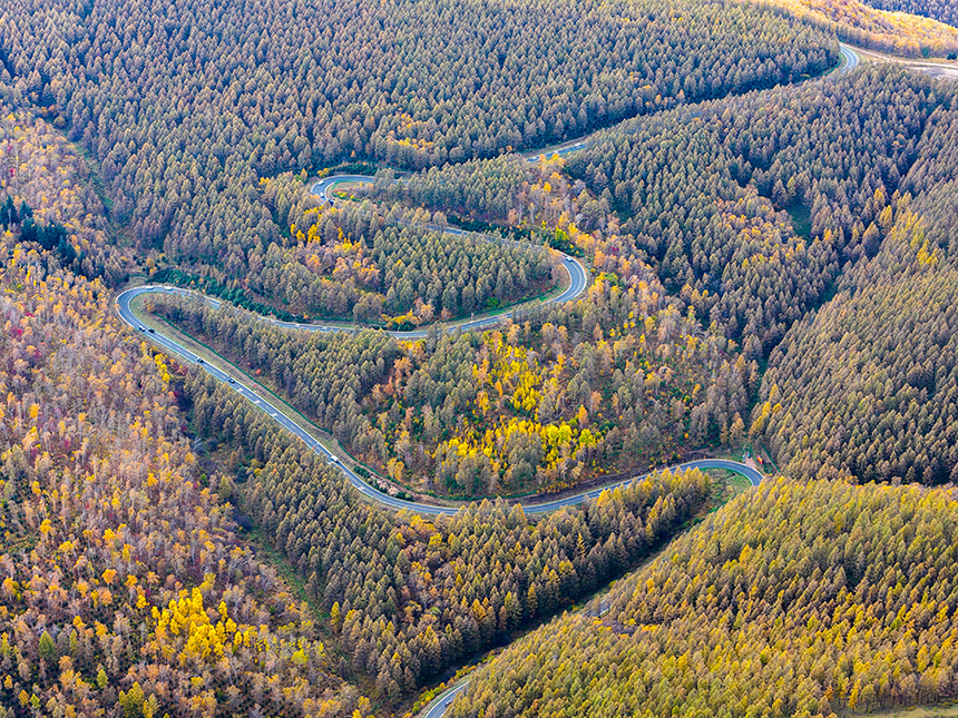 金秋时节,河北省围场满族蒙古族自治县坝上地区层林尽染,如同一幅色彩斑斓的画卷。金黄色的落叶松、墨绿色的樟子松交相呼应,各种植被渐次呈现出绿、黄、红等多种丰富的色彩。