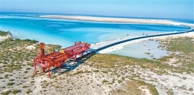 红海旅游项目是共建“一带一路”倡议同沙特“2030愿景”对接的标志性项目。据了解,桩梁一体机专为沙特红海旅游项目研发,命名为“红海愿景1号”。自今年6月投用以来,“红海愿景1号”已顺利完成多个重大节点:首榀双T梁架设、首根PHC桩(预应力高强混凝土)沉桩、首榀预制盖梁安装、红树林浅水区紧接的桥梁段落桥面贯通等。