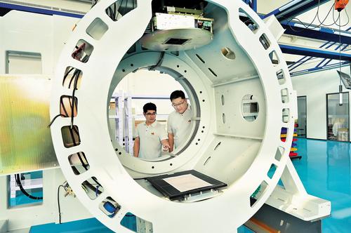 9月15日,新里程医疗(廊坊临空自贸区)集团有限公司技术人员在查看CT图像引导直线加速器。本报记者 王伟摄