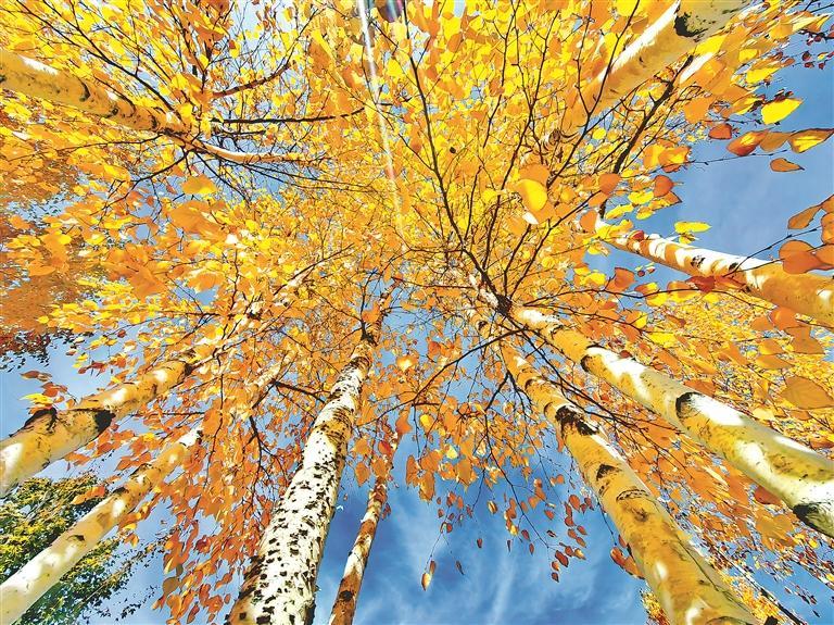 12日,哈尔滨市道里区丽江路附近的松花江畔,一小片白桦林吸引人们驻足观赏、拍照。深秋的白桦树,树干笔直高耸,树皮洁白如纸。枝头的叶子已经由绿色变成了金黄色,在阳光的照耀下,色彩浓重,景色迷人。(记者 苏强摄)