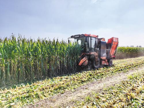 来自河南新乡的农机手赵书杰是一位有着20多年经验的农机驾驶“老把式”。玉米地里,他驾驶着轮式玉米收获机在田垄间前行。收获机前方割台如灵巧的巨手,将一排排玉米秆齐根揽入,机器内部飞速运转,有序完成摘穗、分离。不一会儿,收好的玉米棒便装满了储粮仓。