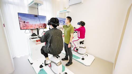 10月9日,在雄安新区容东片区龚庄社区党群服务中心“幸福空间”的VR单车运动空间,社区居民正戴着VR眼镜“骑行”。 本报见习记者郝金钰摄