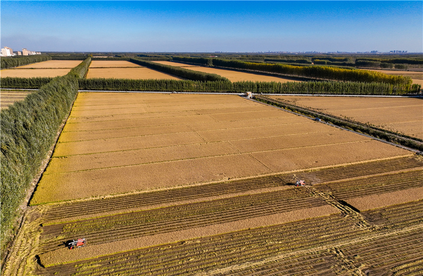 人民网唐山11月1日电 近日,河北省唐山市曹妃甸区水稻相继成熟,农民抢抓农时开始收割,确保应收尽收、颗粒归仓。据介绍,该区今年水稻种植面积达31.46万亩。