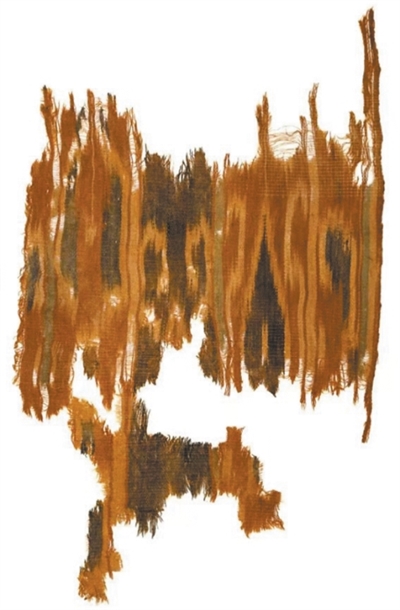 青海都兰热水墓群2018血渭一号墓出土扎经染色织物。  |