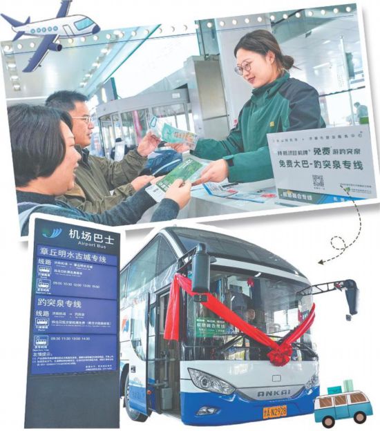 上图:10月27日,济南机场出口柜台处,两位旅客凭登机牌领取免费游趵突泉景区兑换券。下图:济南机场至趵突泉景区专线巴士。