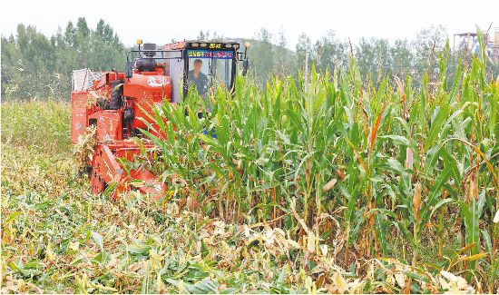10月7日,枣庄市市中区孟庄镇焦庄村,村民使用联合收割机收获玉米。(卢鹏 吉喆报道)