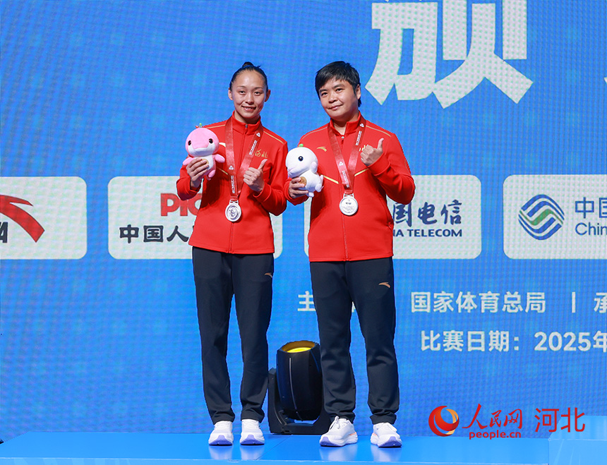 常园与教练张喜燕在领奖台。人民网记者 李兆民摄