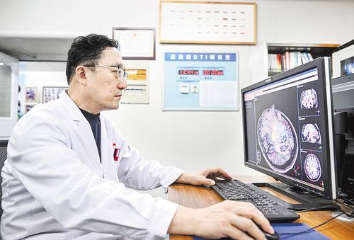 11月7日,故城县医院副院长兼磁共振室主任姜洪新,利用神经纤维束精准成像技术,成功将大脑内密如蛛网的神经网络,以全彩动态形式精准呈现。 本报记者 李东宇摄