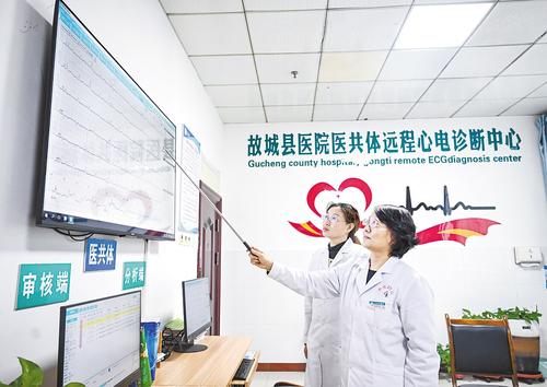 11月7日,故城县医院心电功能科主任扈景英(右)与同事在医共体远程心电诊断中心查看心电图报告。 本报记者 李东宇摄