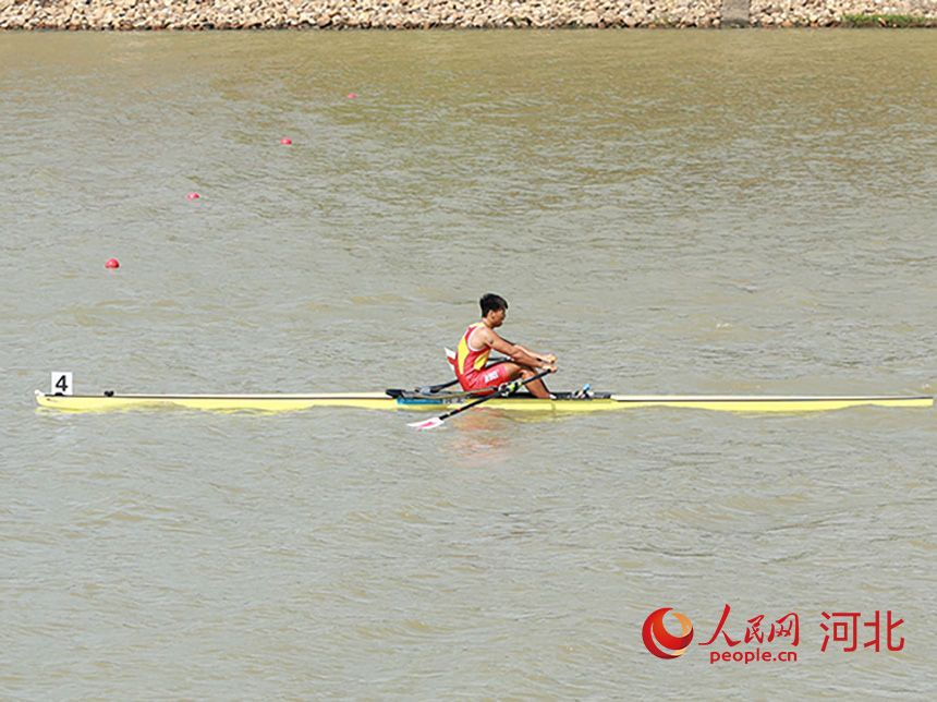 韩崴在赛艇男子单人双桨比赛现场。人民网记者 李兆民摄