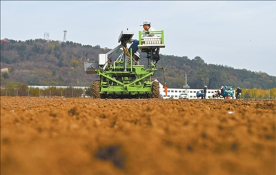 在山东省烟台市农科院试验田里,农机手驾驶播种机播种冬小麦。 孙文潭摄(影像中国)