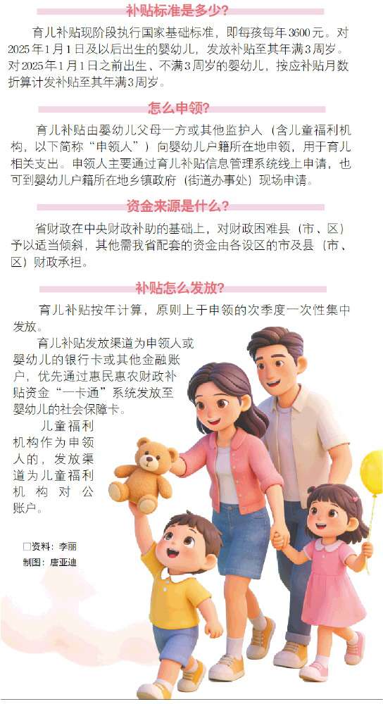 细则明确,育儿补贴现阶段执行国家基础标准,即每孩每年3600元。对2025年1月1日及以后出生的婴幼儿,发放补贴至其年满3周岁。对2025年1月1日之前出生、不满3周岁的婴幼儿,按应补贴月数折算计发补贴至其年满3周岁。