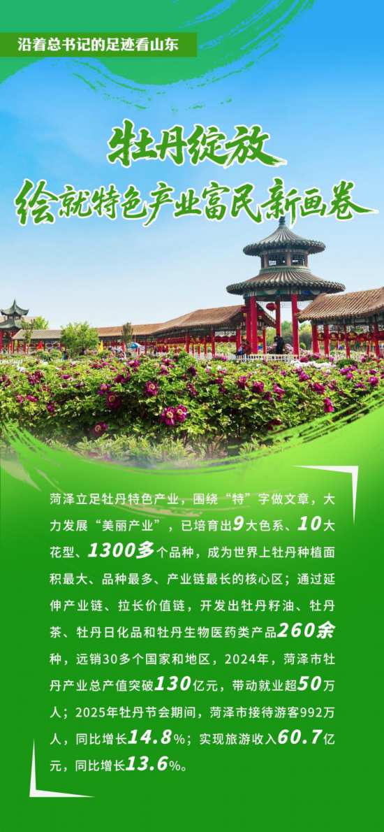 总书记的殷殷嘱托,如明灯照亮前路,为菏泽依托特色资源发展牡丹产业指明了方向。十多年来,菏泽牢记嘱托,围绕“特”字精准发力,大力发展“美丽产业”,通过延伸产业链、拉长价值链、塑造文化IP,带动牡丹产业从种植、种苗、切花、观赏向医药化工、日用化工、食品加工、营养保健、文旅消费等领域延伸,让菏泽牡丹“物尽其用”,走出了一条产业兴旺、农民增收的特色发展之路。