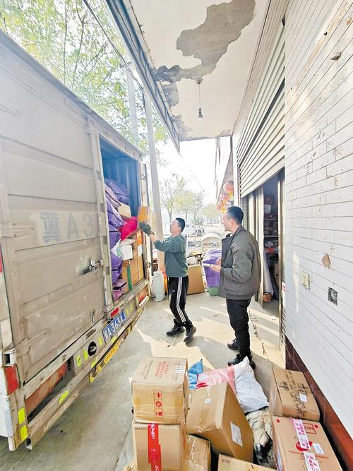 11月12日上午,无极县张段固镇东南丰村快递驿站门口,张满红(右)正在与快递运输车司机一起卸货。 本报记者 王思达摄