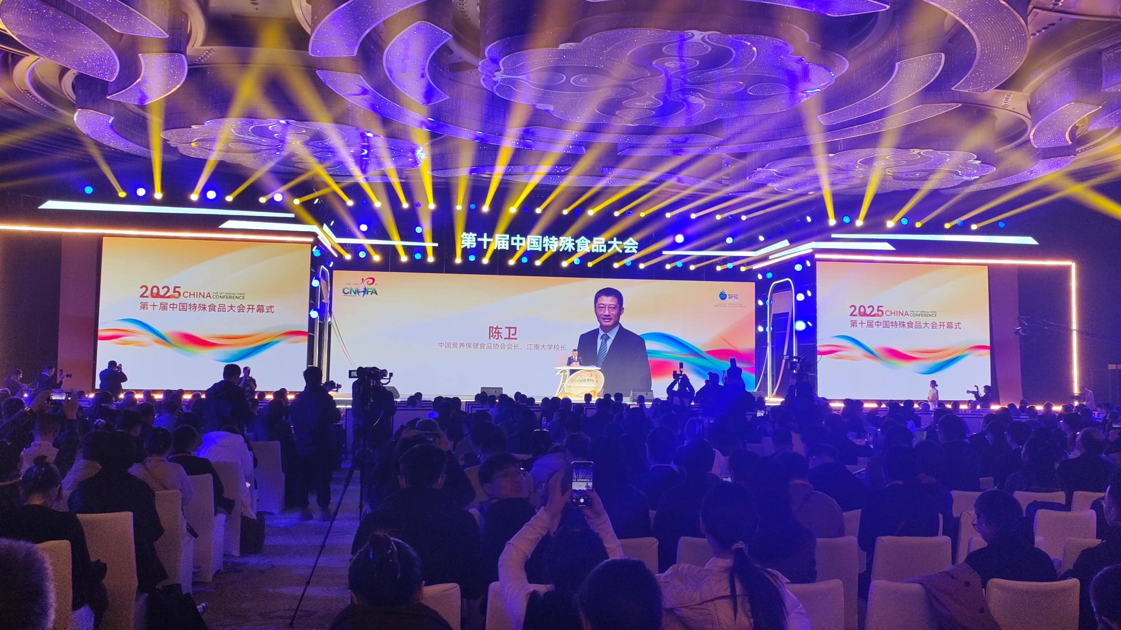 中国营养保健食品协会会长、江南大学校长陈卫代表主办单位致欢迎词时指出,中国营养保健食品协会始终与行业同频共振。坚持科学为本,夯实创新基石;筑牢安全底线,打造责任闭环;促进跨界融合,拓展产业边界。未来将坚持以“‘拾’光织锦 不啻微芒”的精神,与业内外同仁一道共同开启中国特殊食品行业的新篇章。