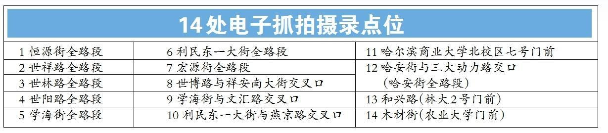 25日,记者从哈尔滨市公安交管部门获悉,为进一步规范道路交通秩序,有效遏制交通违法行为的发生,营造安全、畅通的道路交通环境,根据《中华人民共和国道路交通安全法》相关规定,哈尔滨市公安局交管部门将对以下新增14处电子抓拍摄录点予以公示,主要针对机动车不按规定停放、双排或多排停车行为进行抓拍摄录。(记者 何兴丽)