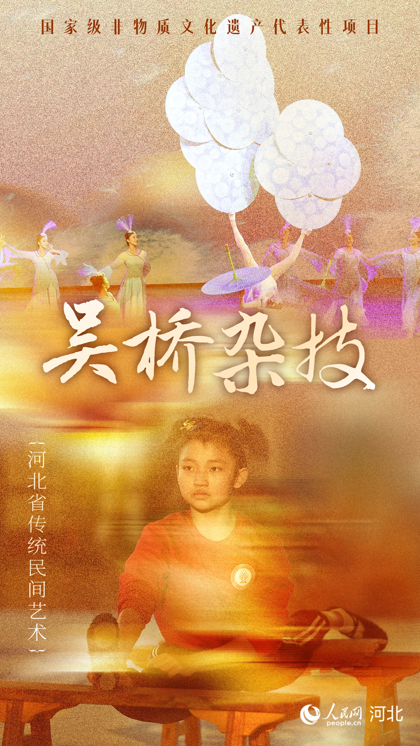 吴桥杂技起源于春秋角抵戏,历经岁月沉淀,迄今已衍生出11大类近千种绝技,2006年被列入第一批国家级非物质文化遗产名录。2021年,吴桥获文旅部“中国民间文化艺术之乡”命名。“上至九十九,下至刚会走,吴桥耍杂技,人人有一手。”两千多年的传承,使其形成了独特的民间杂技文化体系和深厚的群众基础。