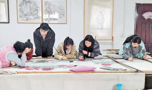 2025年3月,在宁晋县河渠工笔画小镇赵艳文画院内,几位工笔画学员正在学习培训。 宁晋县河渠工笔画小镇提供