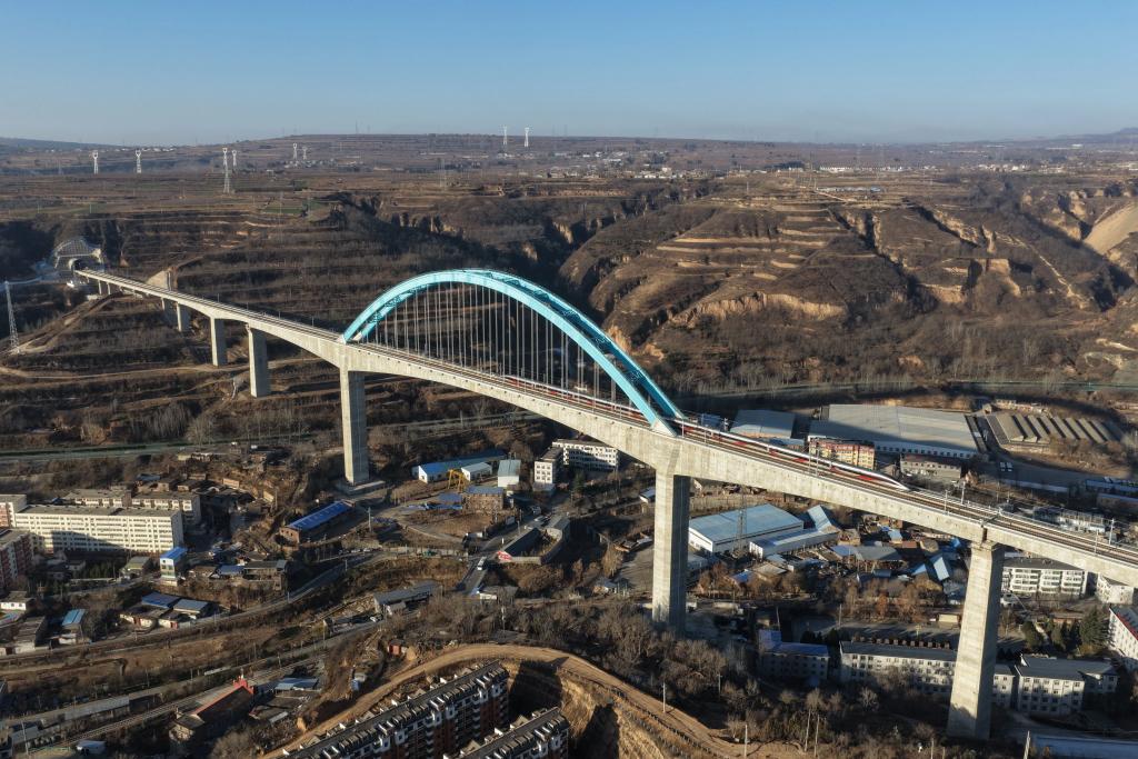 12月25日,试验列车驶过西延高铁王家河特大桥(无人机照片)。新华社记者 邢广利 摄