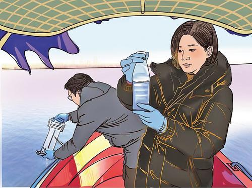 12月,刘冬梅(右)和同事在白洋淀上采集水样、检测水质。 徐冲手绘