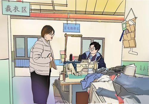 12月,王伟肖(左)在邻里驿站向工作人员了解最近经营情况,并帮助其解决遇到的问题。 徐冲手绘