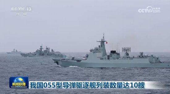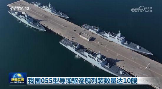 055型驱逐舰是我国自主研制建造的吨位最大、技术最先进、综合作战能力最强的万吨驱逐舰,集先进雷达、通用垂发、综合射频于一体。自2020年1月首舰南昌舰入列以来,海军055型导弹驱逐舰入列数量已达10艘。(新闻联播)