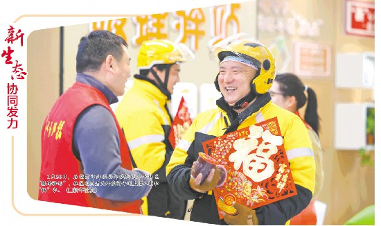 1月26日,在临沂市郯城县郯城街道郯中社区“暖蜂驿站”,社区志愿者为外卖骑手送上腊八粥和“福”字。(新华社发)
