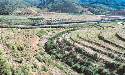 野生亚洲象在云南省西双版纳傣族自治州大渡岗乡活动,中老铁路货物列车限速通行。 |