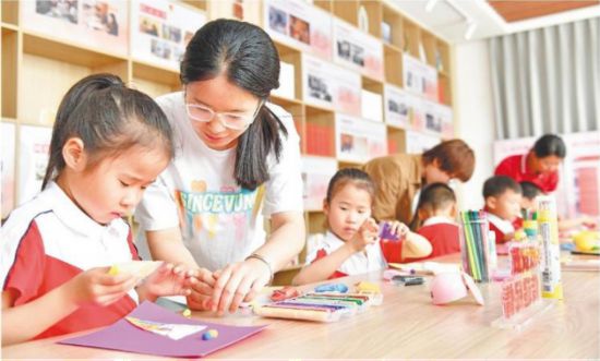 日照东港城市书房石臼所馆内,书香与童趣交织,志愿者耐心地教孩子们制作黏土画,五彩的黏土在小手中变幻出奇思妙想,绘出童年最纯真的底色。