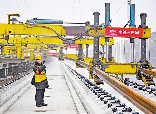 12月19日,中铁十四局建设者在京港高铁雄商段进行铺轨施工。 本报记者 张 昊摄