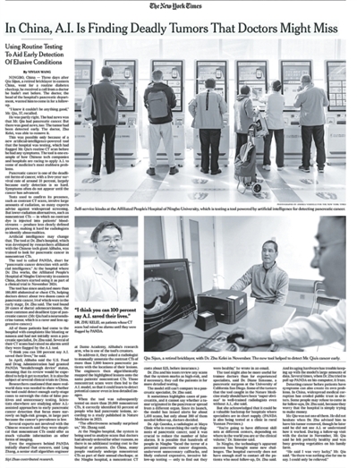 近日,美国《纽约时报》发表整版报道,介绍了阿里巴巴研发的胰腺癌早筛人工智能(AI)模型,成功帮助医生发现了原本可能遗漏的致命肿瘤,挽回了多名患者的生命。这篇报道引发美国网友热议:“看看,这才是新兴技术的正确用法。”