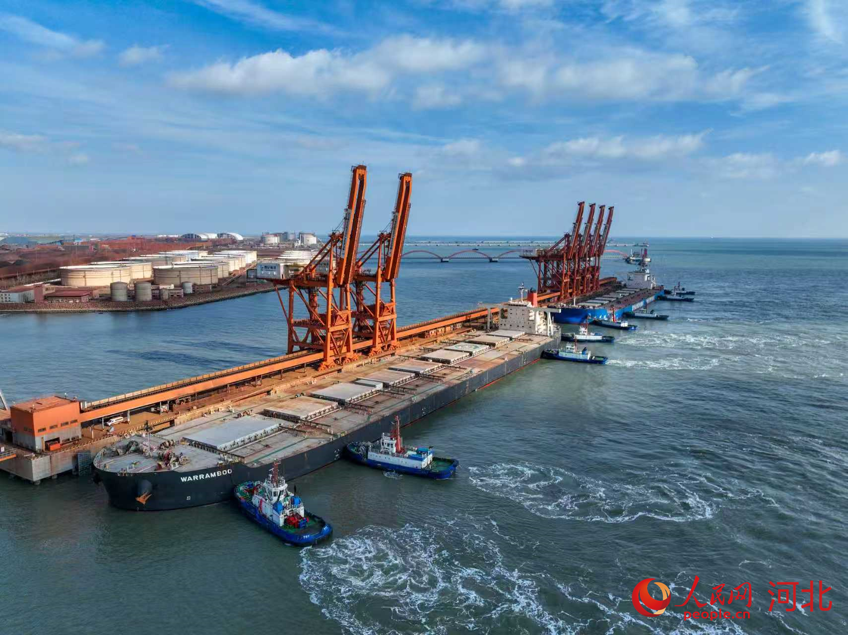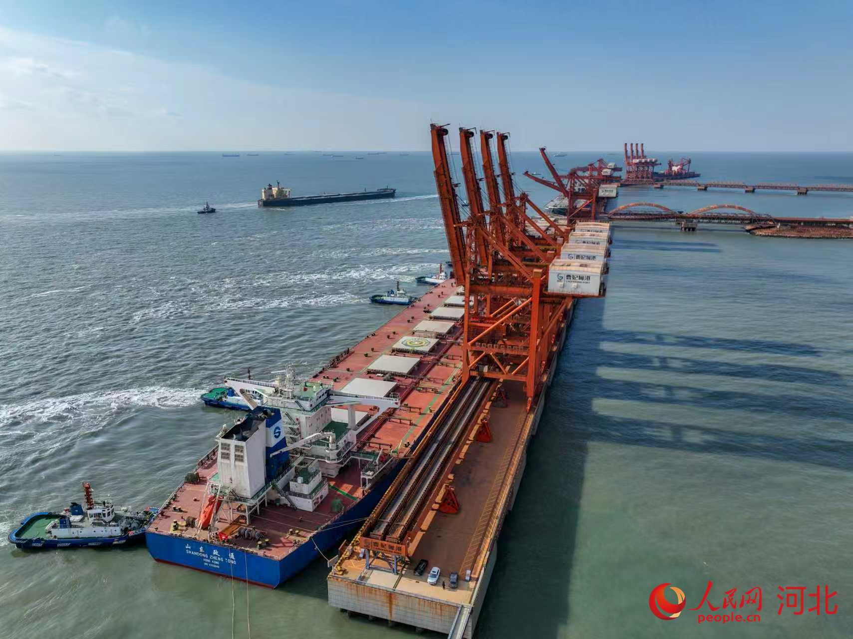 1月13日,在拖轮的协助下,货轮正在靠泊河北唐山曹妃甸港区矿石码头。人民网记者 林福盛摄