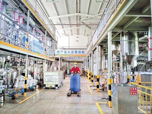 近日,位于曲周县的晨光生物科技集团股份有限公司中试中心内,工作人员正在运送半成品原料。李卫国摄