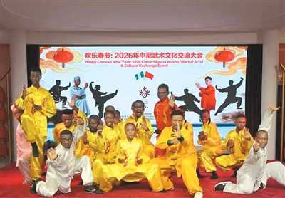 2月8日,由尼日利亚中国文化中心和中国武术协会联合主办的“欢乐春节:2026年中尼武术文化交流大会”在阿布贾举办。本次武术文化交流大会活动共分为武术表演、武术研修故事分享及互动体验等三个板块。中国武术协会代表团成员表演了集体南拳、翻子拳、太极扇、双鞭、猴棍等多个高水平武术节目。阿布贾武术协会则带来了太极和少林功夫表演。尼日利亚联邦首都区“中国之角”所在学校和当地国际学校的学生还带来了基本拳法和体操表演。