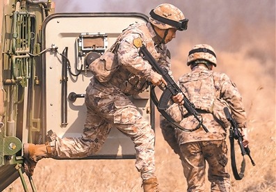 官兵进行车组协同战斗训练。