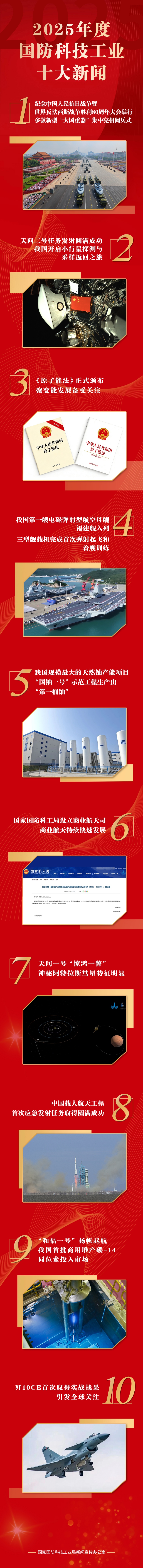 人民网北京1月12日电 (记者赵竹青)近日,国家国防科技工业局新闻宣传办公室正式对外发布2025年度国防科技工业十大新闻。