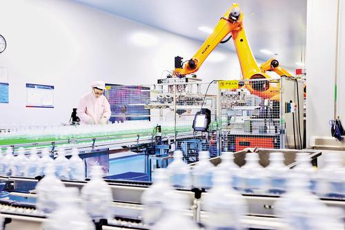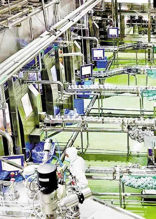 2月11日,石家庄四药集团员工在直立式软袋输液生产线上忙碌。 本报记者 史晟全摄