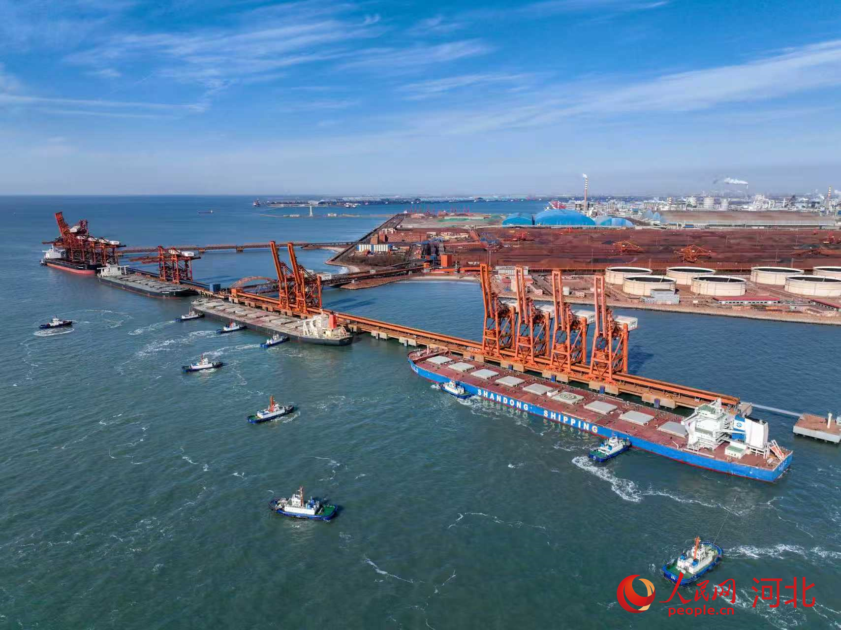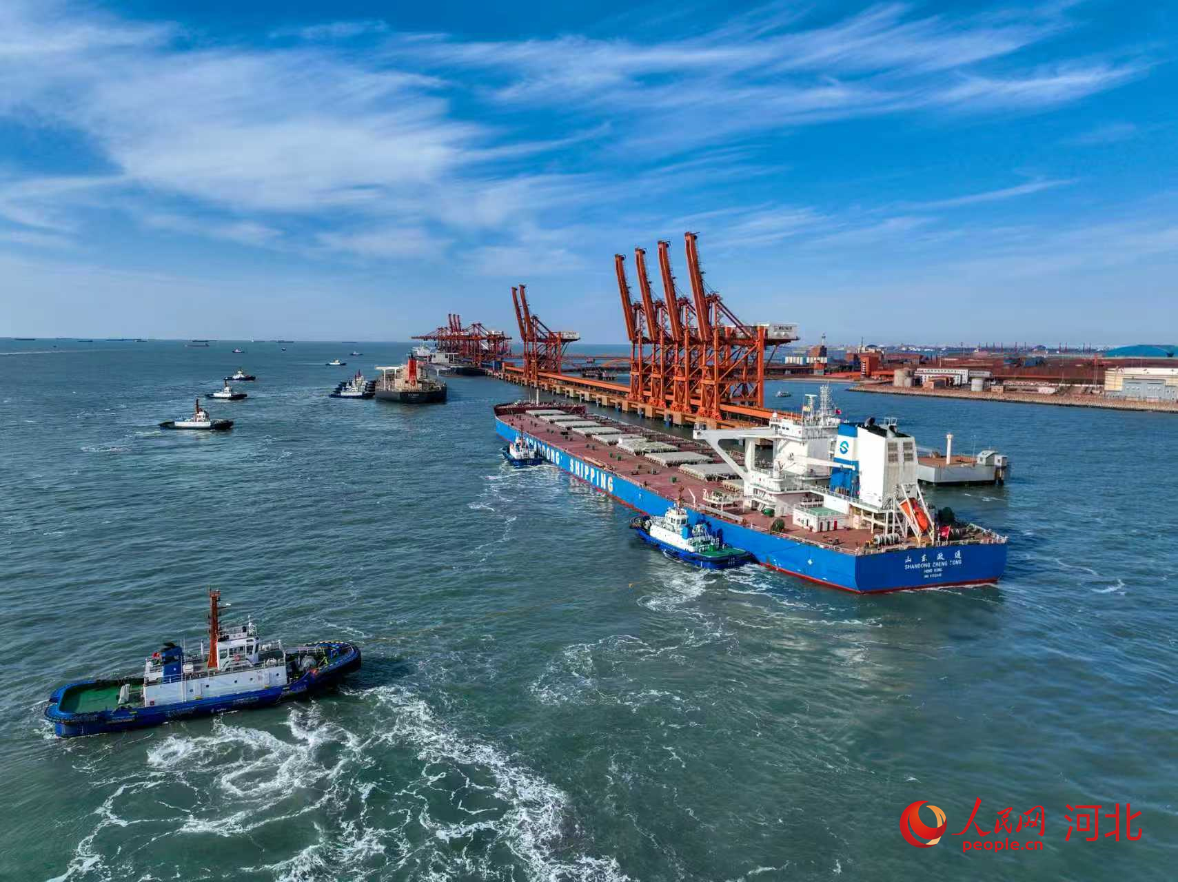 1月13日,在拖轮的协助下,货轮正在靠泊河北唐山曹妃甸港区矿石码头。人民网记者 林福盛摄