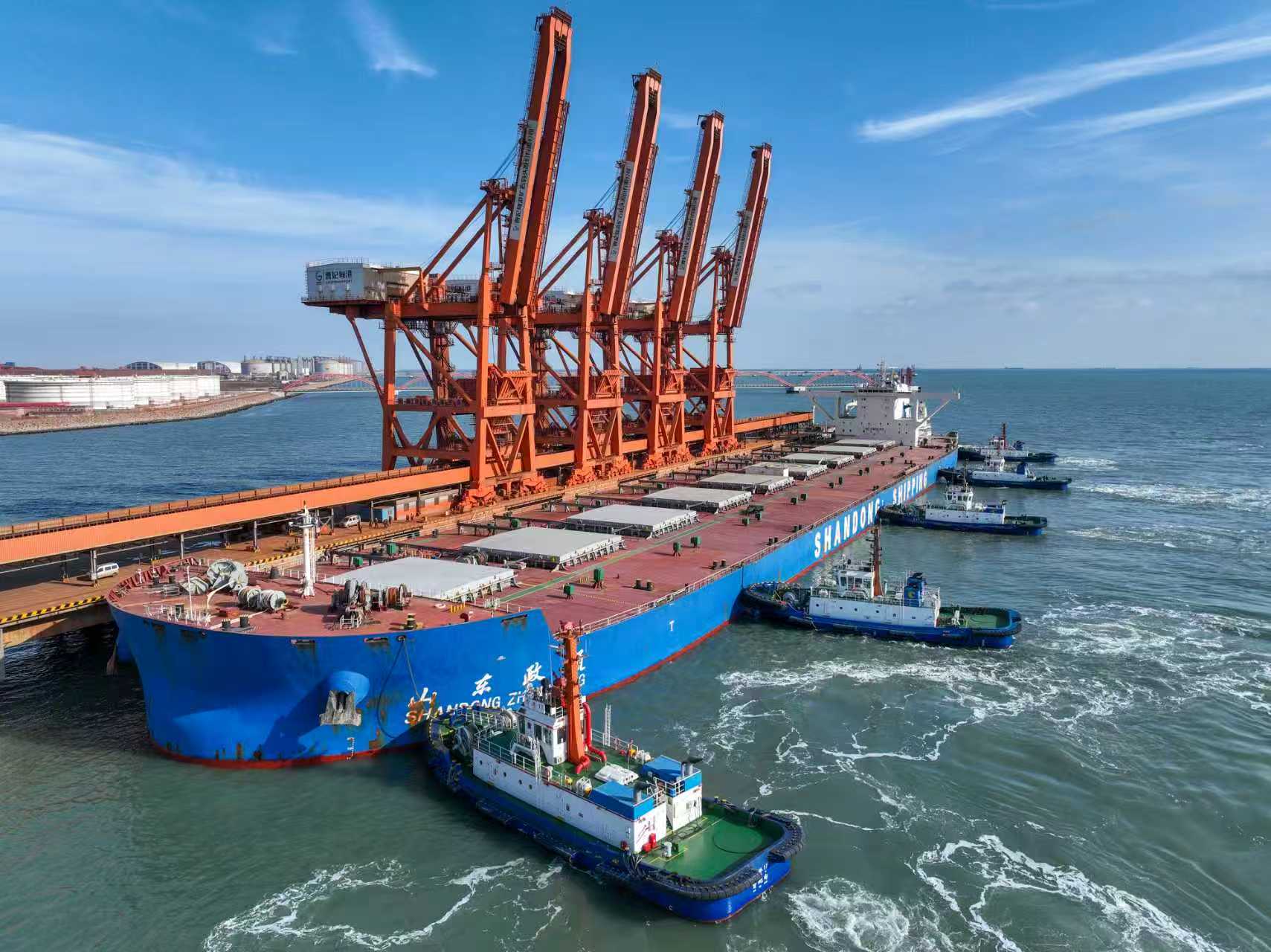 1月13日,在拖轮的协助下,货轮正在靠泊河北唐山曹妃甸港区矿石码头。卢铭摄