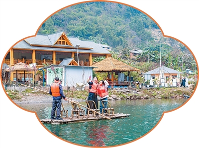 云南昭通市绥江县南岸村,游客乘竹筏游览山水美景。 |