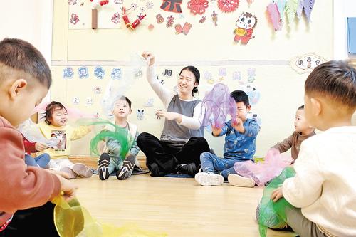 1月13日,在衡水市桃城区小萝卜托育中心,保育老师带着孩子们做游戏。 本报记者 焦磊摄